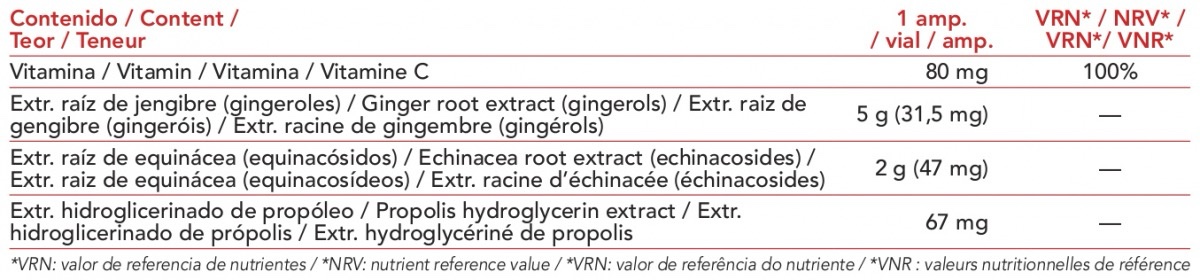 Extracto de raíz de jengibre (Zingiber officinale L.), 0,63% en gingeroles; agua; extracto de raíz de equinácea (Echinacea purpurea L.), 2,35% en equinacósidos; vitamina C; extracto hidroglicerinado de propóleo; glicósidos de esteviol E 960 (edulcorante procedente de Stevia rebaudiana Bertoni).