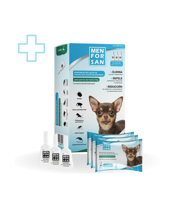 MENFORSAN® Contiene Permetrina (200mg) y Imidacloprid (40mg), elimina y protege durante 4 semanas pulgas, garrapatas, y mosquitos flebótomos.
